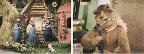 Those are supposed to be the Three Little Pigs on the left and the Cat and the Fiddle (as in "Hey Diddle Diddle") on the right. (Don't worry, purists; I watched Soldiers in black and white.) Folks, these stills don't really begin to capture the sheer, absolute terror of these creatures. I mean, I understand that make-up and costuming techniques weren't as sophisticated in 1934, but these costumes are seriously creepy. The faces don't move, for one thing. The cat in particular looks dead-eyed and lifeless. For another, they're this Dr. Moreau-esque hybrid of human and animal that look out of place in what's presented as a generally happy fantasy land. There's one moment where one of the pigs bites the hand of the bad guy, but of course, the mouth doesn't really move (thankfully, none of these abominations have any dialogue).